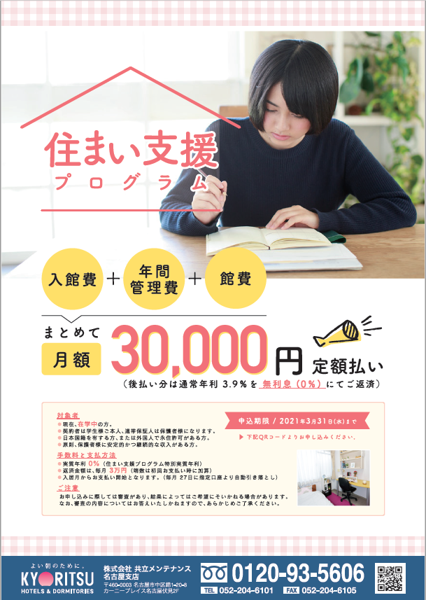 こちらの制度をご利用いただくと、入居期間中月々3万円のお支払いでドーミーをご利用いただく