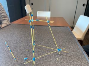 自立可能で出来るだけ高いタワーを立て、タワーの上にマシュマロを置きます。(パスタに刺してもOKです)