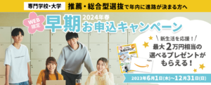 AO入試や推薦入試などで年内にご進学が決まる方にお得なキャンペーンとなっておりますので、是非チェックしてみてください!